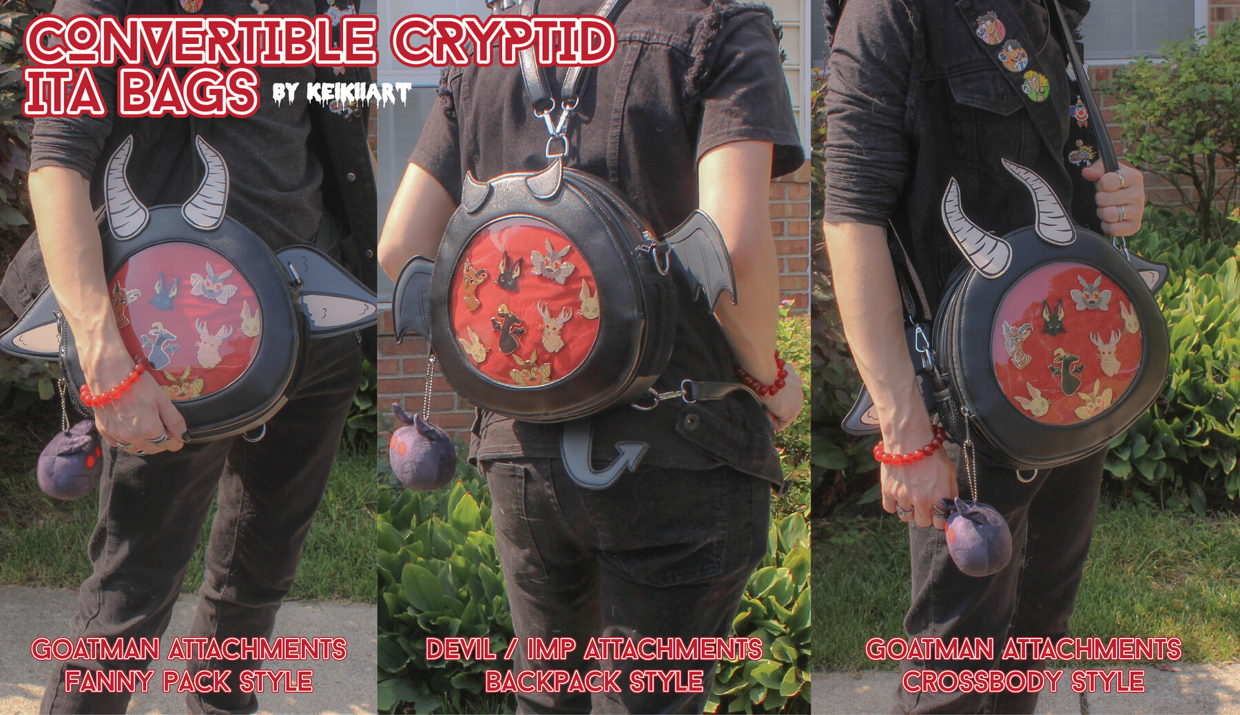 Each convertible cryptid ita bag comes with 4 total straps; one fanny pack strap, one crossbody strap, and two backpack style straps. You can attach whichever suits your needs the most, and if those needs change, you can swap them out with no issues! Ways to style this bag are nearly endless. :)